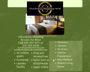 If you have clients are in need of immediate housing, especially in Casa Grande or any of Olive Branch Residential Home’s other locations, please contact them at 623-297-6171 or 313-729-2506. You can also email info@olivebranchresidential.com or visit their website at olivebranchresidential.com for any questions or to learn how to start the placement process. They are ready to help make the transition smooth and stress-free and support both you and your clients every step of the way.