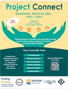 Project Connect is an annual event, hosted in partnership with the City of Casa Grande, United Way of Pinal County, CAHRA, St Anthony’s Church, and other various community organizations. The concept is to connect community members with services, resources, and referrals. There will be a variety of agencies in attendance to provide wrap-around services to attendees. Our attendees include unsheltered individuals, low-income families, and anyone else in the area who needs help.